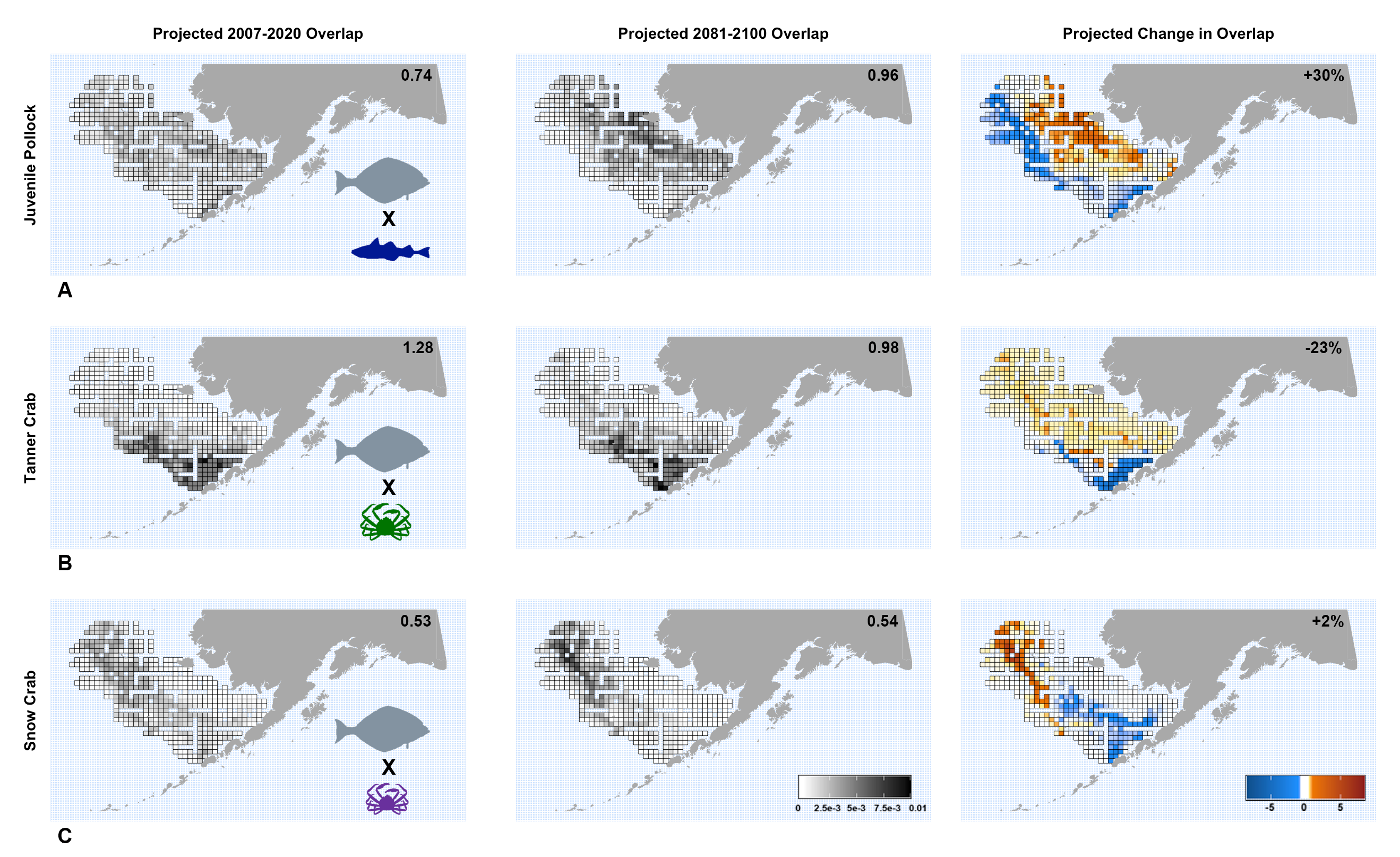 Variation in species’ tolerance to climate change conditions may result in changes to the strength of ecological relationships that structure and maintain the stability of ecosystems. I evaluated how historical (1982-2019) and projected (2030 through end-of-century) warming in the Eastern Bering Sea (EBS), Alaska, affects predator-prey interactions for some of the most commercially valuable fisheries in the U.S. These potential shifts in predator-prey interactions will not only impact the structure of ecological communities, but also the human communities that rely on these resources. The EBS is the largest marine ecosystem in Alaska and is already transitioning from an arctic to a subarctic system. Using a species distribution modeling approach for seven species and an ensemble of 18 statistically downscaled climate models, I project how further temperature increases will affect the geographic similarity between predator and prey populations, the proportion of locations where predator and prey co-occur, and their encounter rates. Projections suggest predator-prey encounter rates in historic prey refuges will increase, intensifying predation pressure for prey, while projections of decreasing encounter rates in the outer shelf and southern EBS indicate predators may not have sufficient prey to maintain high abundance in these regions. This study establishes that the strength of predator-prey relationships will be impacted by climate change conditions, potentially altering the relative importance of predators and prey in the system and reshaping the structure of the EBS trophic web.