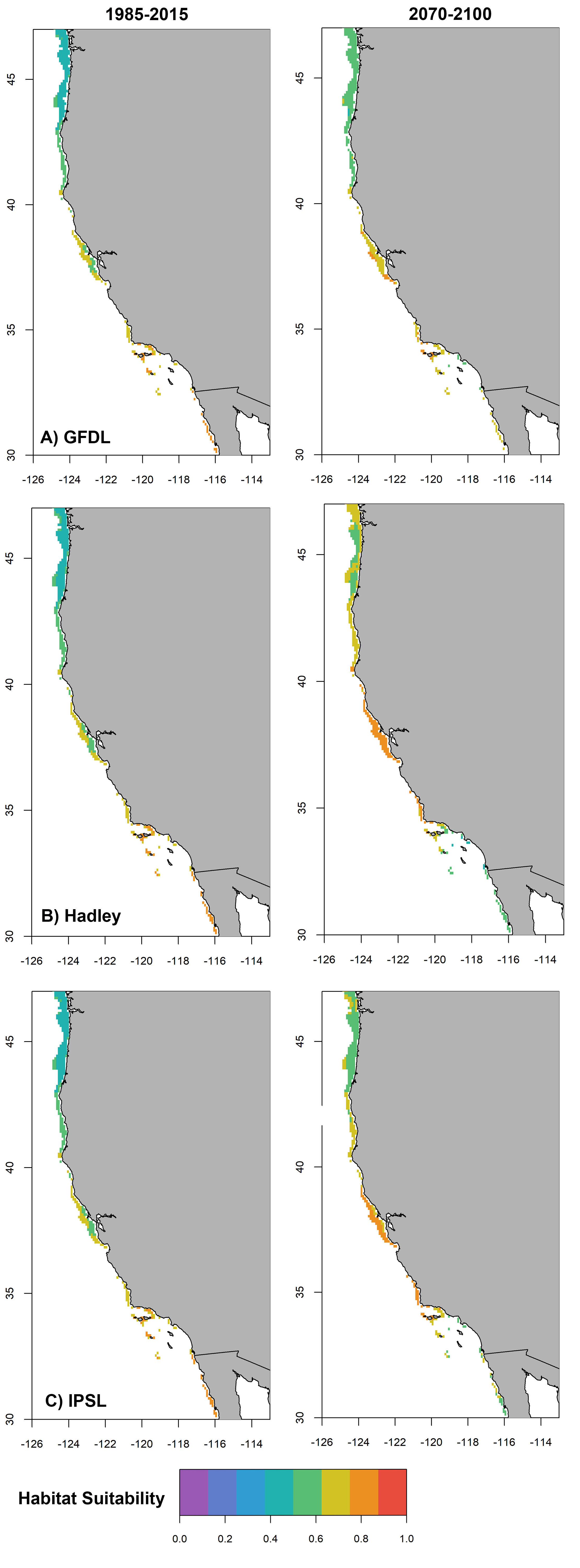 California Market Squid (Doryteuthis opalescens) is often ranked as the top fishery in the state for both pounds landed and ex-vessel value, but the short-lived species’ abundance and distribution is tightly tied to environmental conditions. To prepare for the impacts of climate change, we need to understand the vulnerability of both Market Squid and squid fishery participants to future conditions in the California Current System. I used a network analysis approach to examine how relationships among squid permitted vessels, squid buyers, and ports adapted to past climate perturbations (El Niño and La Niña years). I then used a dynamically downscaled climate model to project changes in Market Squid’s habitat suitability and center of gravity by the year 2100.
